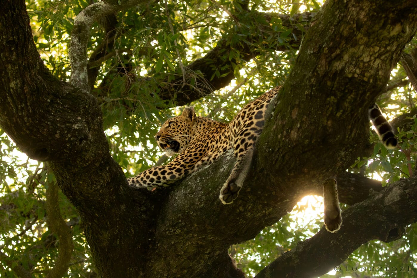 While we were still in pursuit of the wild dogs, another call came through on the radio: Xinzele and her cub had been found. She lay sprawled in a jackalberry tree, an impala kill draped over the branches above her.