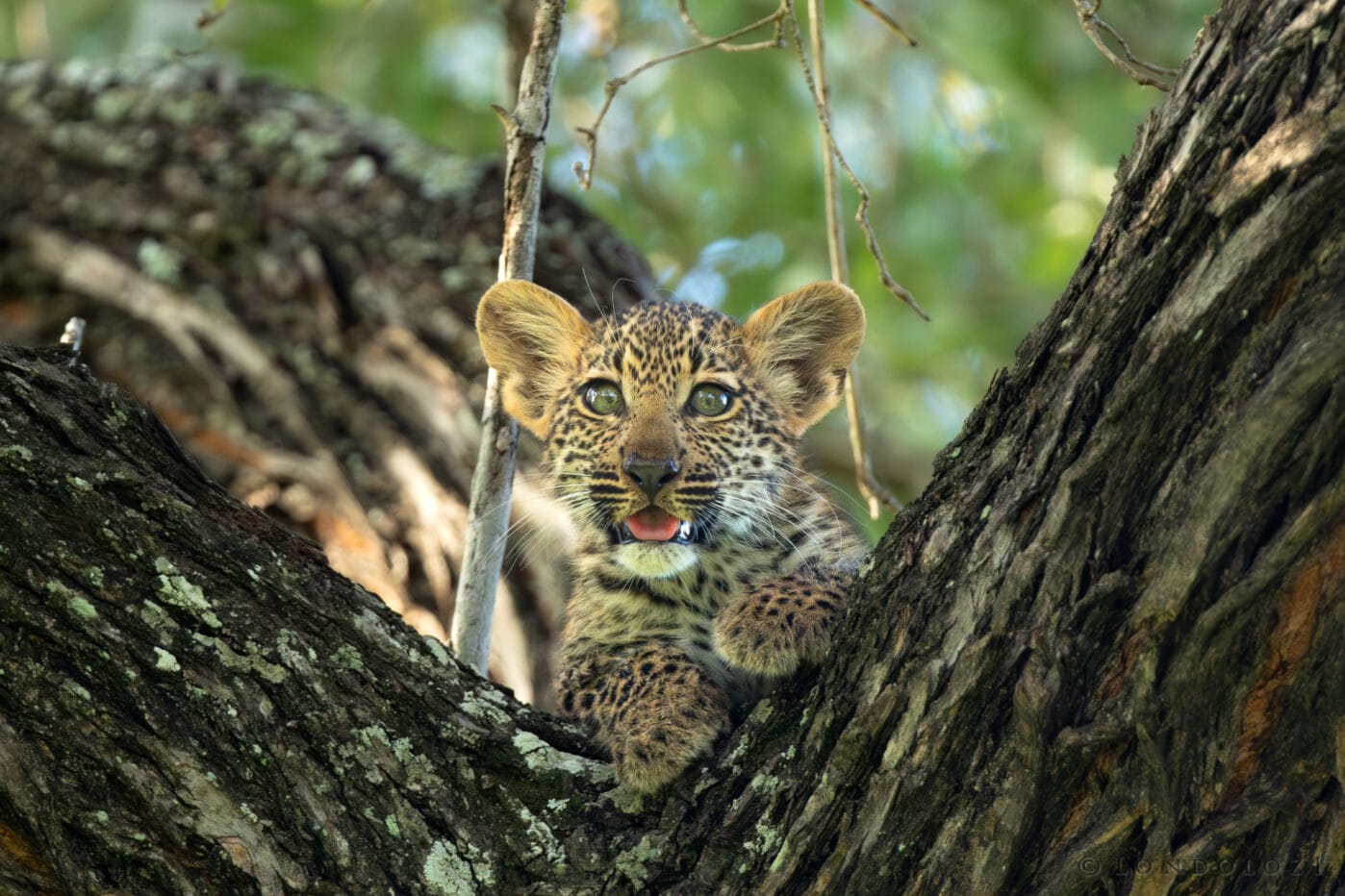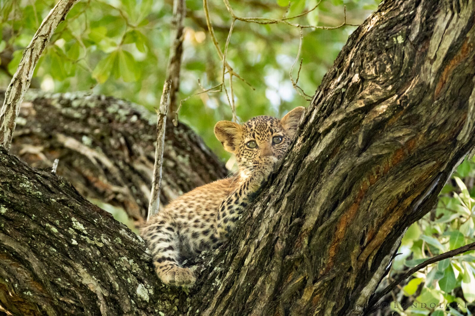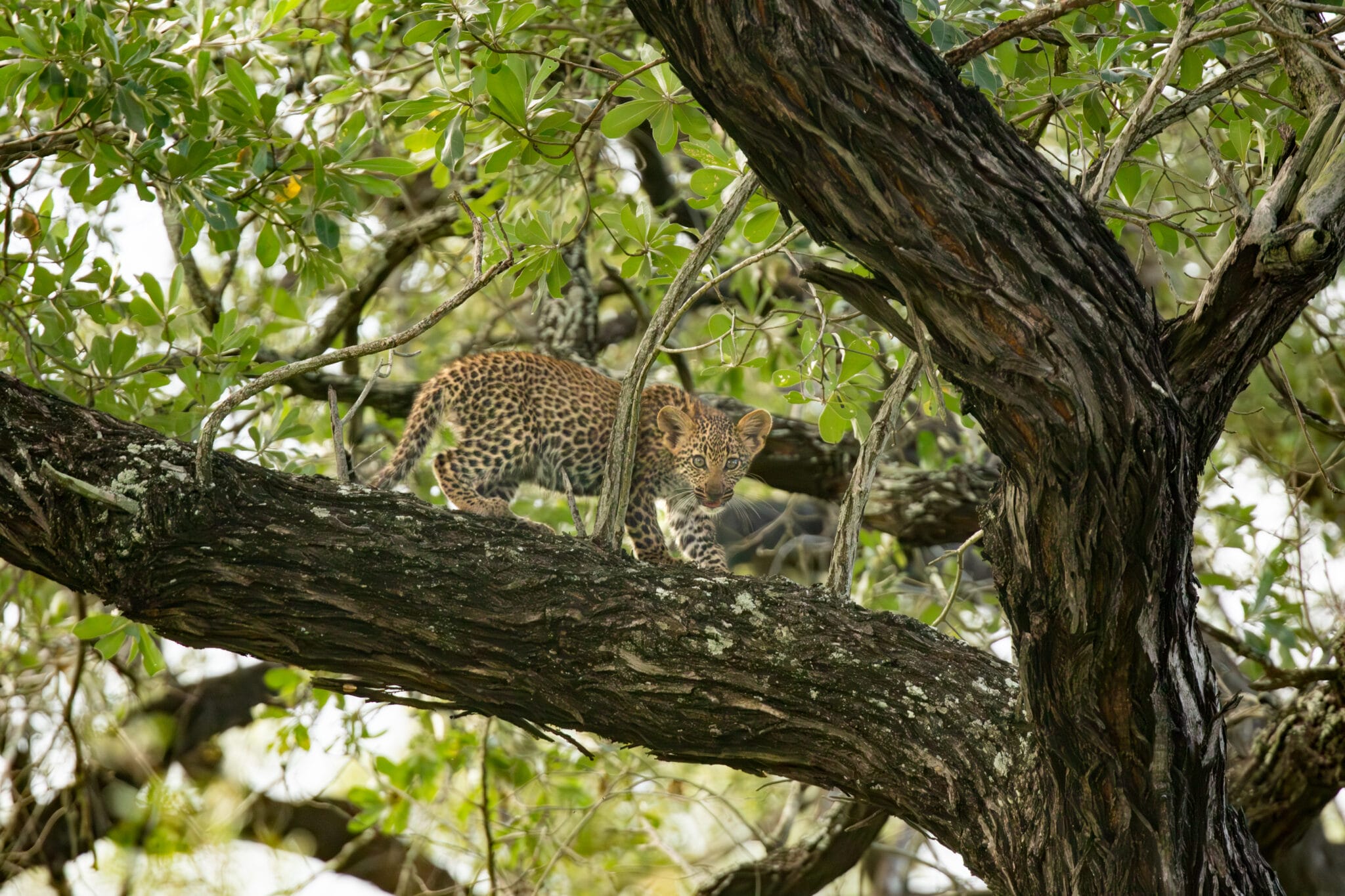 Then, about twenty meters away, near another tree, the sharp alarm calls of starlings broke the silence. A possible clue. We looped to get a clearer view. Tracker Sersant suddenly whispered, “Stop. Hand me your binoculars.” That was always a good sign. I scanned in the direction of his gaze, my heart pounding. And there it was—something small and tentative moving along a high branch. The cub.